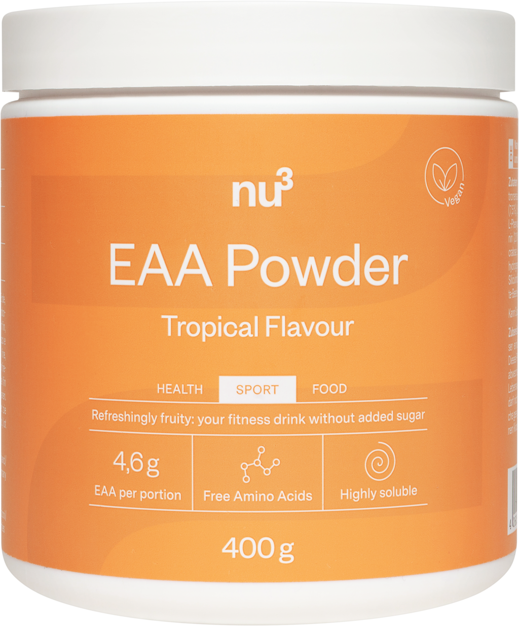 Maksimoi harjoittelusi ylimääräisellä annoksella välttämättömiä aminohappoja. Nu3 EAA-jauhe tarjoaa sinulle kaiken, mitä tarvitset urheilullisten tavoitteidesi saavuttamiseksi – ilman lisättyä sokeria ja 100 % vegaanisesti.