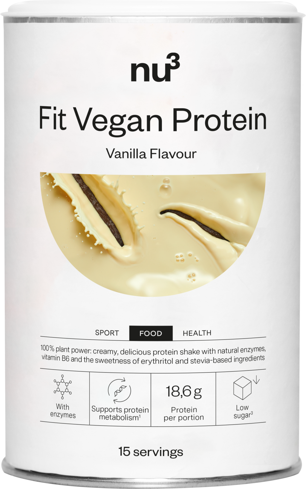 Nauti täydellisestä vegaanisesta proteiinilähteestä nu3 Fit Vegan Protein Shaken avulla. Korkealaatuinen sekoitus yhdistää viisi kasvipohjaista proteiinilähdettä: herne, härkäpapu, riisi, manteli ja kikherne, ja sisältää täydellisen aminohappoprofiilin. Annoskohtaisesti resepti tarjoaa 17 g proteiinia ja vain 1,4 g sokeria. Kiitos erytritolin ja stevia-kasvin luonnollisen makeuden, shake tarjoaa aitoa makua ilman keinotekoisia aromeja. Seos on rikastettu B6-vitamiinilla sekä entsyymeillä bromelaiinilla ja papaaiinilla, ja sitä voi käyttää monipuolisesti shakeissa, smoothieissa, puurossa tai leivonnassa.