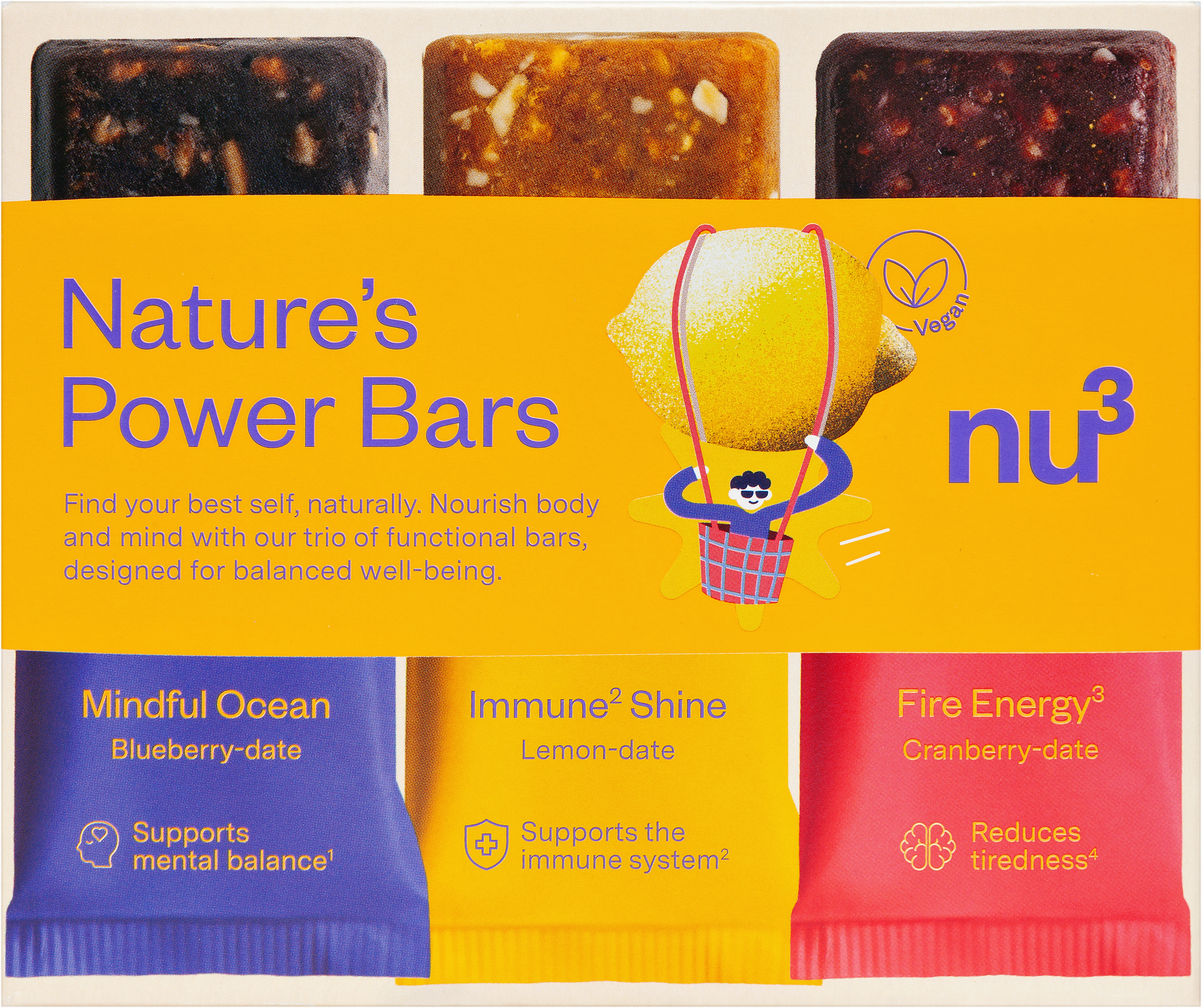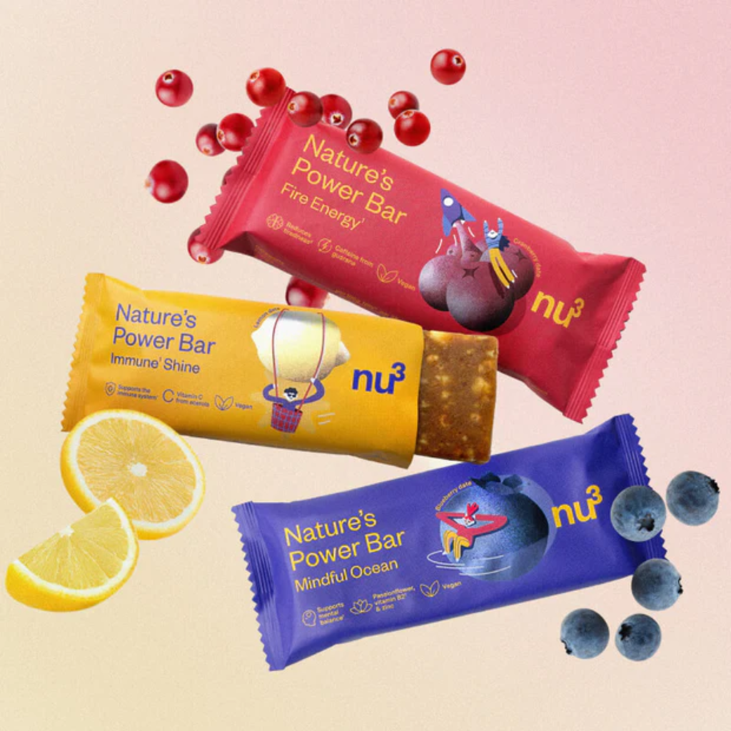 Nauti tietoisesti päivittäisistä välipaloista nu3 Nature’s Power Barien avulla. Kasvipohjaiset patukat koostuvat taateleista, cashewpähkinöistä ja toiminnallisesta kasviproteiinista. Valitse Power¹, Immun-Support³ tai Balance⁴ väliltä ja nauti värikkäistä hedelmäpatukoista ilman makeutusaineita ja keinotekoisia aromeja.