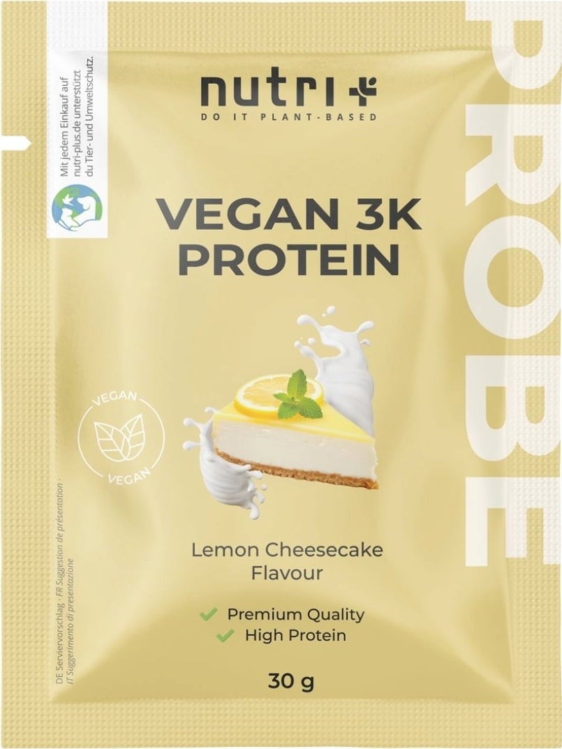 nutri + Vegaaninen 3K proteiinijauhe, kokeilukoko, Juustokakku (30 g)