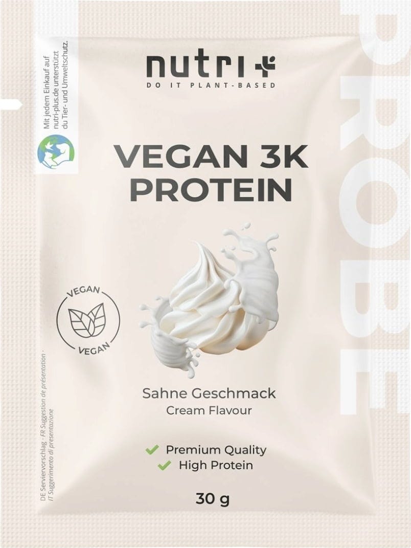 nutri + Vegaaninen 3K proteiinijauhe, kokeilukoko, Kerma (30 g)