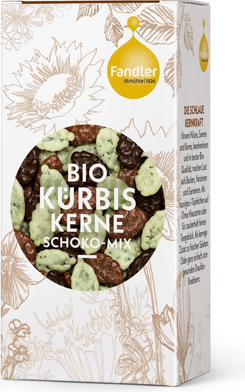 Ölmühle Fandlerin Kurpitsansiemenet Suklaasekoitusta varten siemenet kuivataan huolella ennen kuin ne kuorrutetaan valko- maito- ja tummalla suklaalla, tehden niistä vastustamattoman rapean naposteltavan.