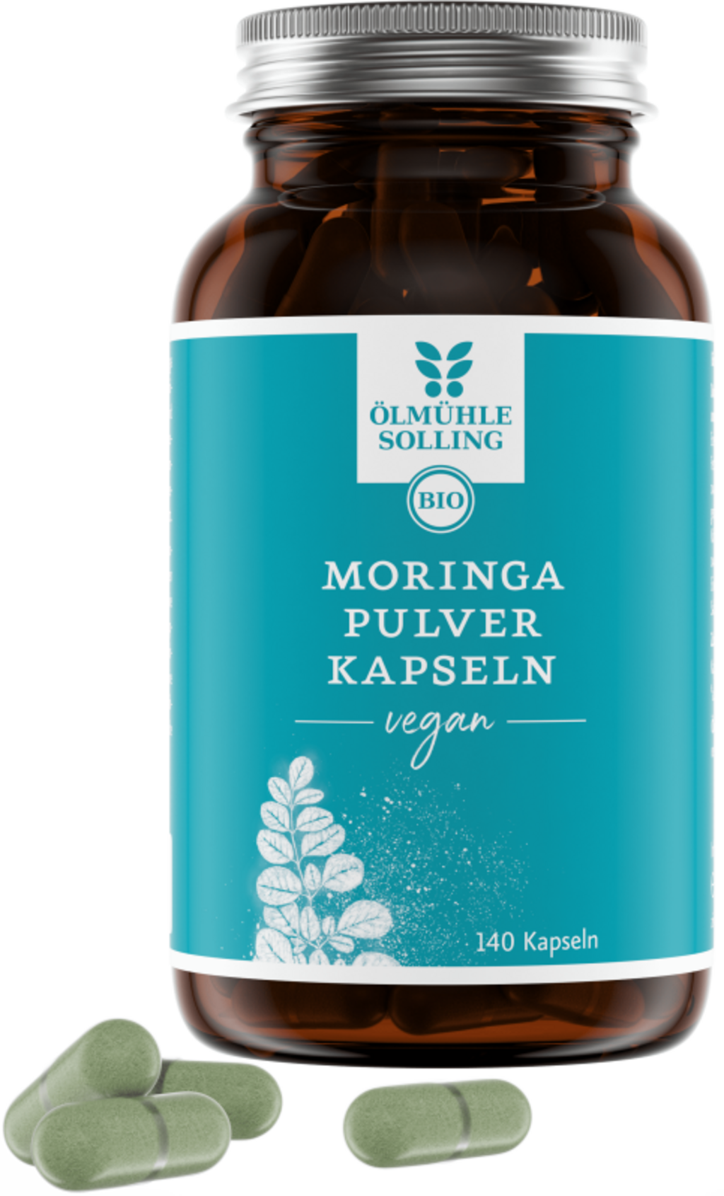 Ölmühle Sollingin vegaanisissa kapseleissa oleva moringajauhe valmistetaan intialaisista moringalehdistä. Moringalehdet ovat rikaita A-, E-, B1- ja B2-vitamiineissa sekä kalsiumissa, raudassa, kaliumissa, magnesiumissa ja luonnollisissa antioksidanteissa. Lehdet kuivataan hellävaraisesti ja jauhetaan ennen kuin ne täytetään kasvisperäisiin kapselinkuoriin. Täytön jälkeen kapselinkuoret kiinnitetään mekaanisesti ilman lämpöä, jotta moringajauheen ravinteet säilyisivät mahdollisimman hyvin.