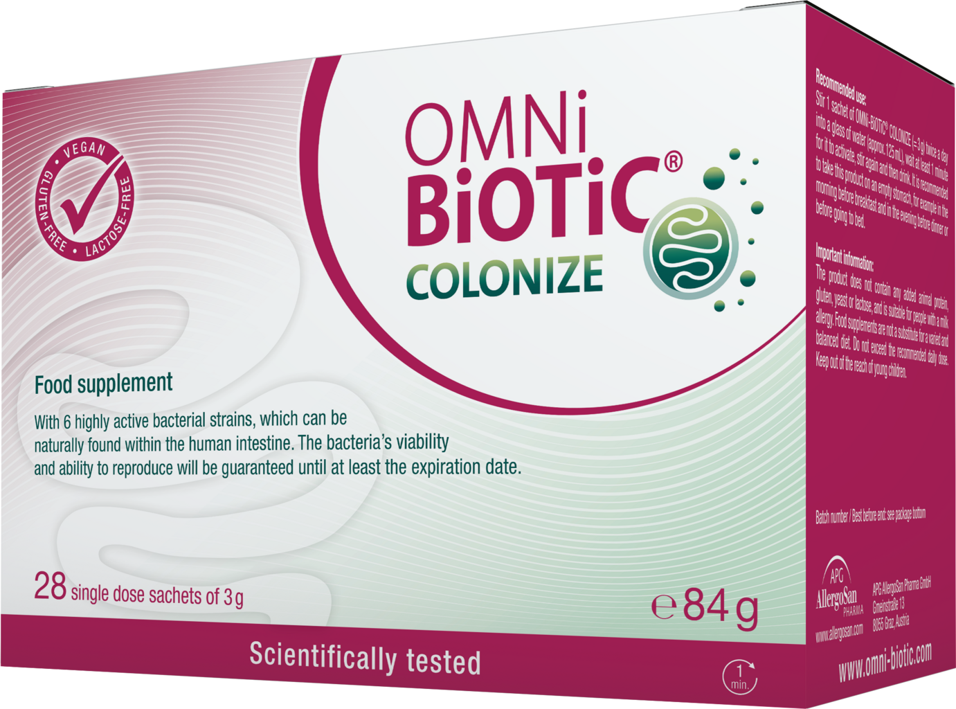OMNi-BiOTiC® COLONIZE yhdistää 6 tieteellisesti valikoitua bakteerikantaa, jotka esiintyvät ihmisen suolistossa ja voivat tukea kehoasi erityisesti kolonoskopian jälkeen. Vegaaninen jauhe tarjoaa 18 miljardia bakteeria päivän annosta kohden, jotka asuttavat suolistoasi luonnollisesti uudelleen.