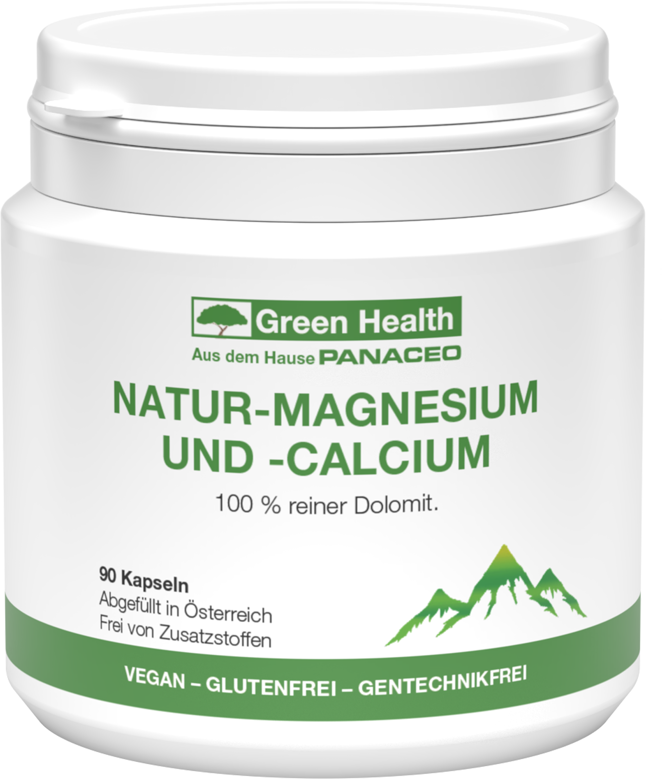 Green Health Natur-Magnesium ja -Calcium -kapselit Panaceolta tukevat päivittäistä mineraalien saantia. Ne sisältävät hienoksi jauhettua dolomiittikiveä – luonnollinen kalsiumin ja magnesiumin lähde hyvin imeytyvässä muodossa.