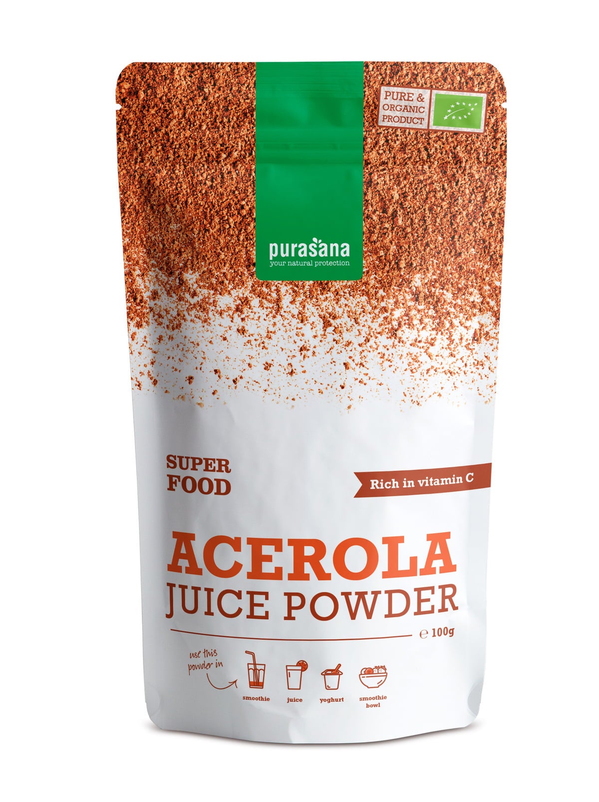 Purasanan Acerola-jauhe tuo smoothieisi, mysleihisi ja moneen muuhun herkullisen hapokkaan maun. Acerola sisältää runsaasti C-vitamiinia, joten jauhe on täydellinen lisä ruokavalioosi.