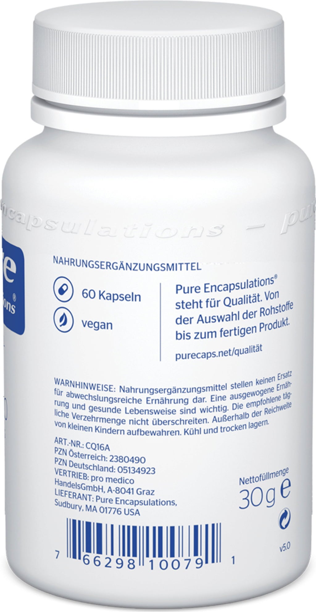 Pure Encapsulations® CoQ10 saadaan hiivasoluista biofermentaatioprosessin kautta, jolloin se on myös biologisesti aktiivisessa muodossa. Yksi kapseli sisältää 120 mg koentsyymiä Q10.tä.
