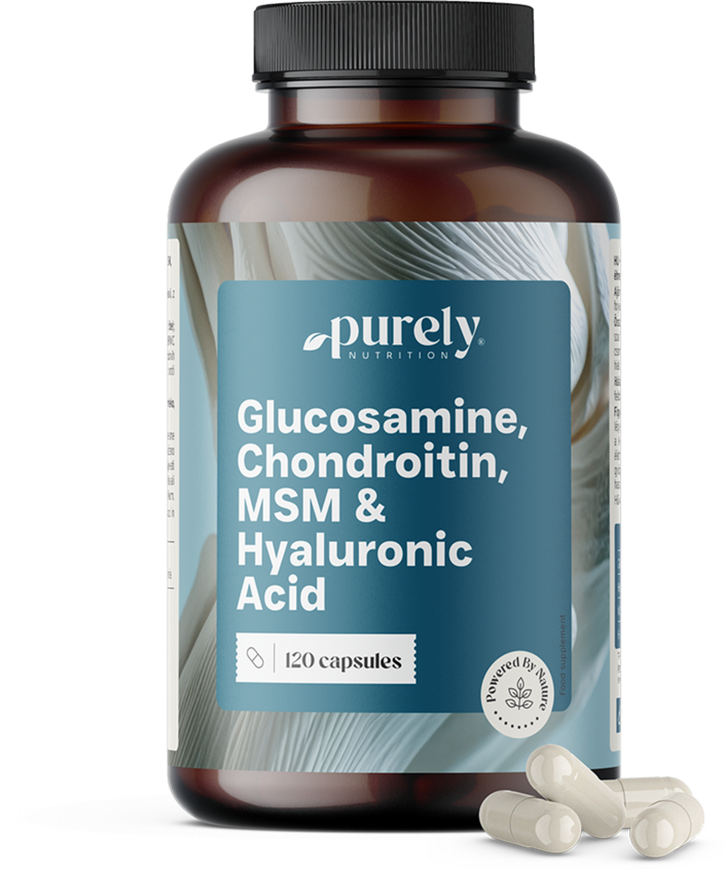 Nämä Purely Nutritionin kapselit sisältävät laadukkaan kompleksin glukosamiinista, kondroitiinista, MSM:stä ja hyaluronihaposta. Nämä ainesosat ovat välttämättömiä ihmisen liikuntaelimistölle. Kapselit sopivat siksi erinomaisesti pitkäaikaiseen tukemiseen vanhemmille ihmisille ja urheilijoille.