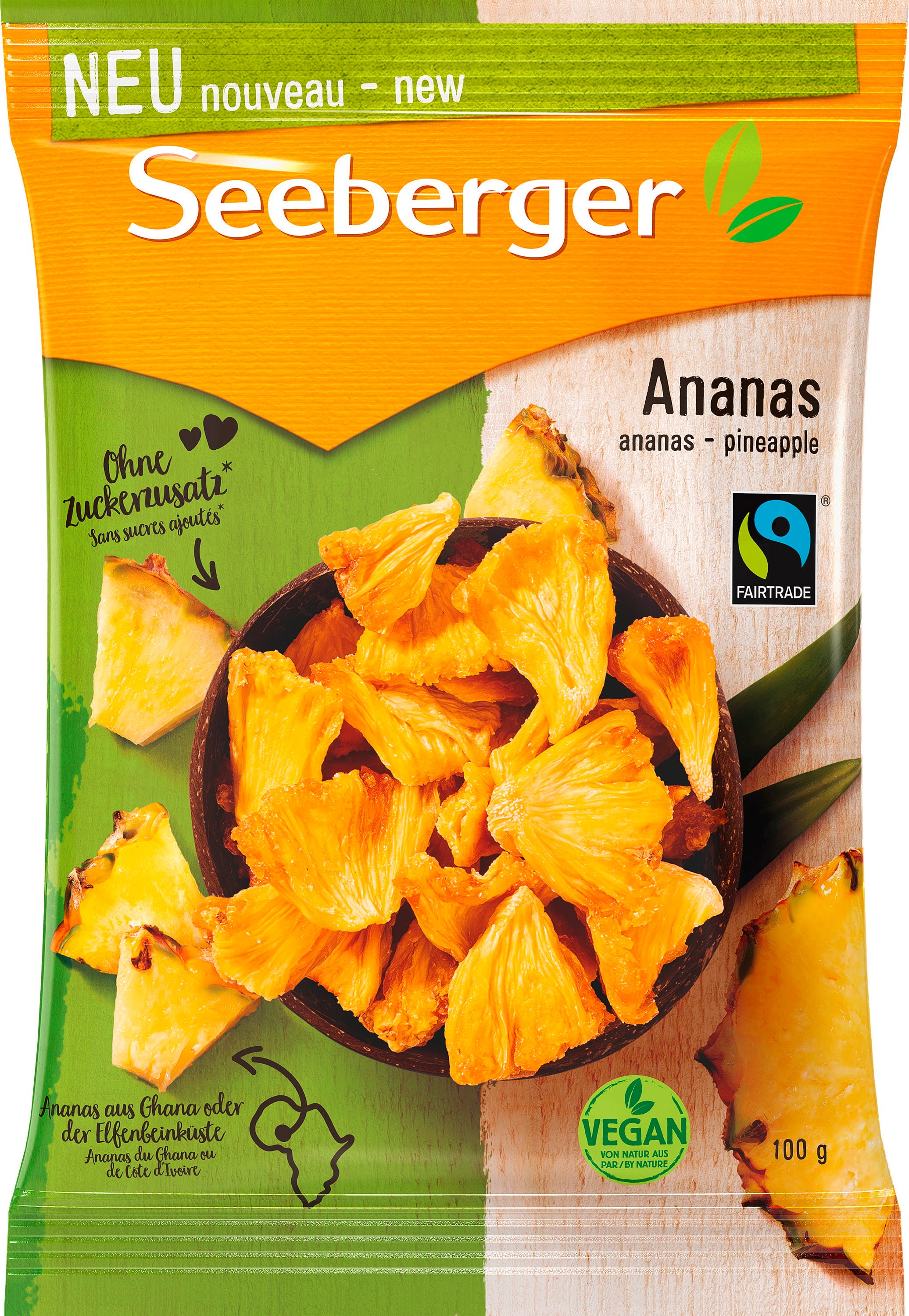 Tämän herkullisen kuivatun ananaksen avulla Seebergeriltä saat hedelmäisen välipalanautinnon! Ghanassa kestävän kehityksen mukaisesti ja reilusti tuotettu, tämä ananas ei sisällä lisättyä sokeria ja ilahduttaa eksoottisen hedelmällisellä aromillaan. Nauti 100 % luonnollisista raaka-aineista ja aidosta mausta!