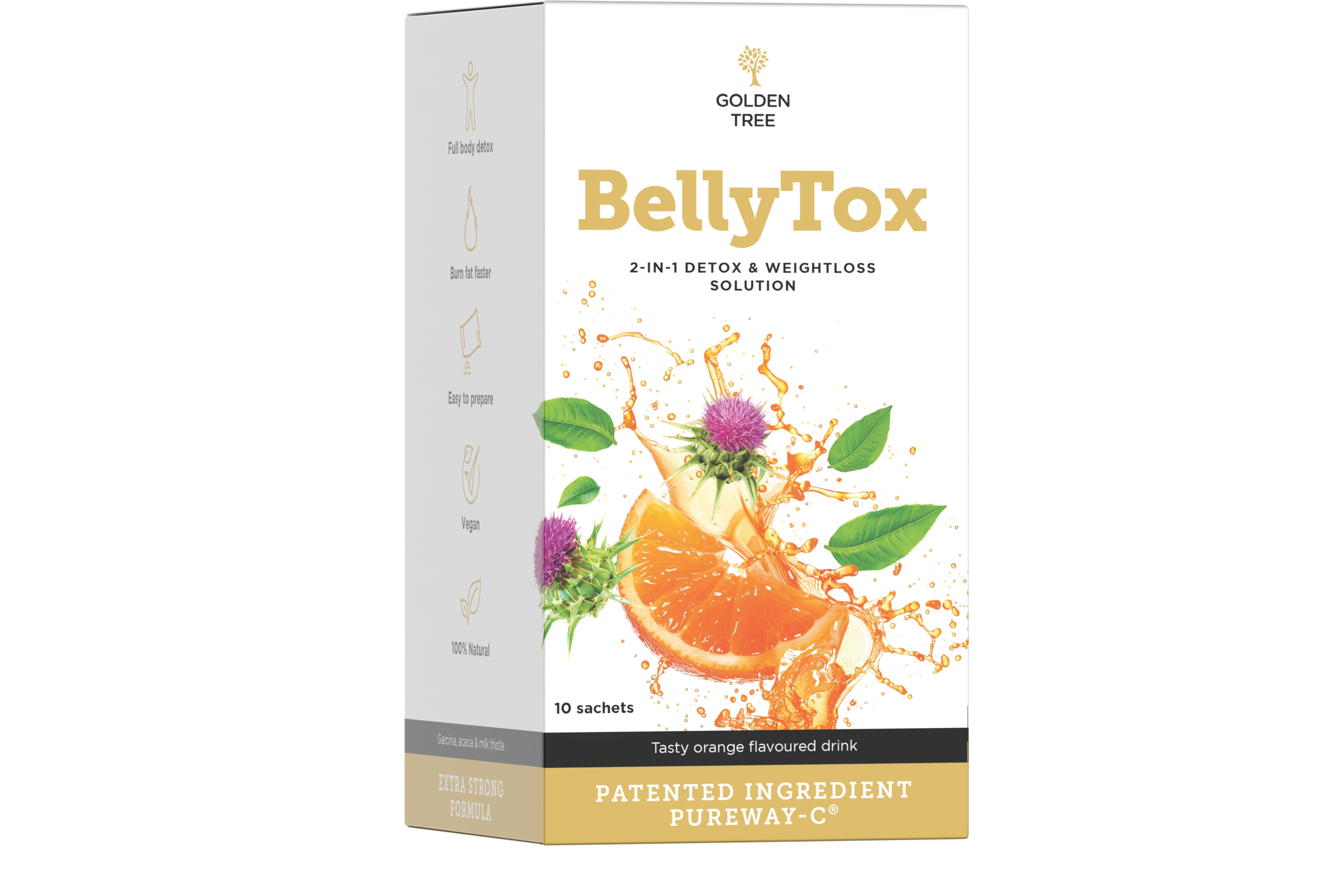 BellyTox Golden Treeltä on ainutlaatuinen ravintolisä, joka sisältää PureWay-C® - patentoitu C-vitamiinin muoto - joka edistää normaalia energiantuotantoaineenvaihduntaa. Luonnonmukainen kasviuutteiden valikoima täydentää koostumusta.