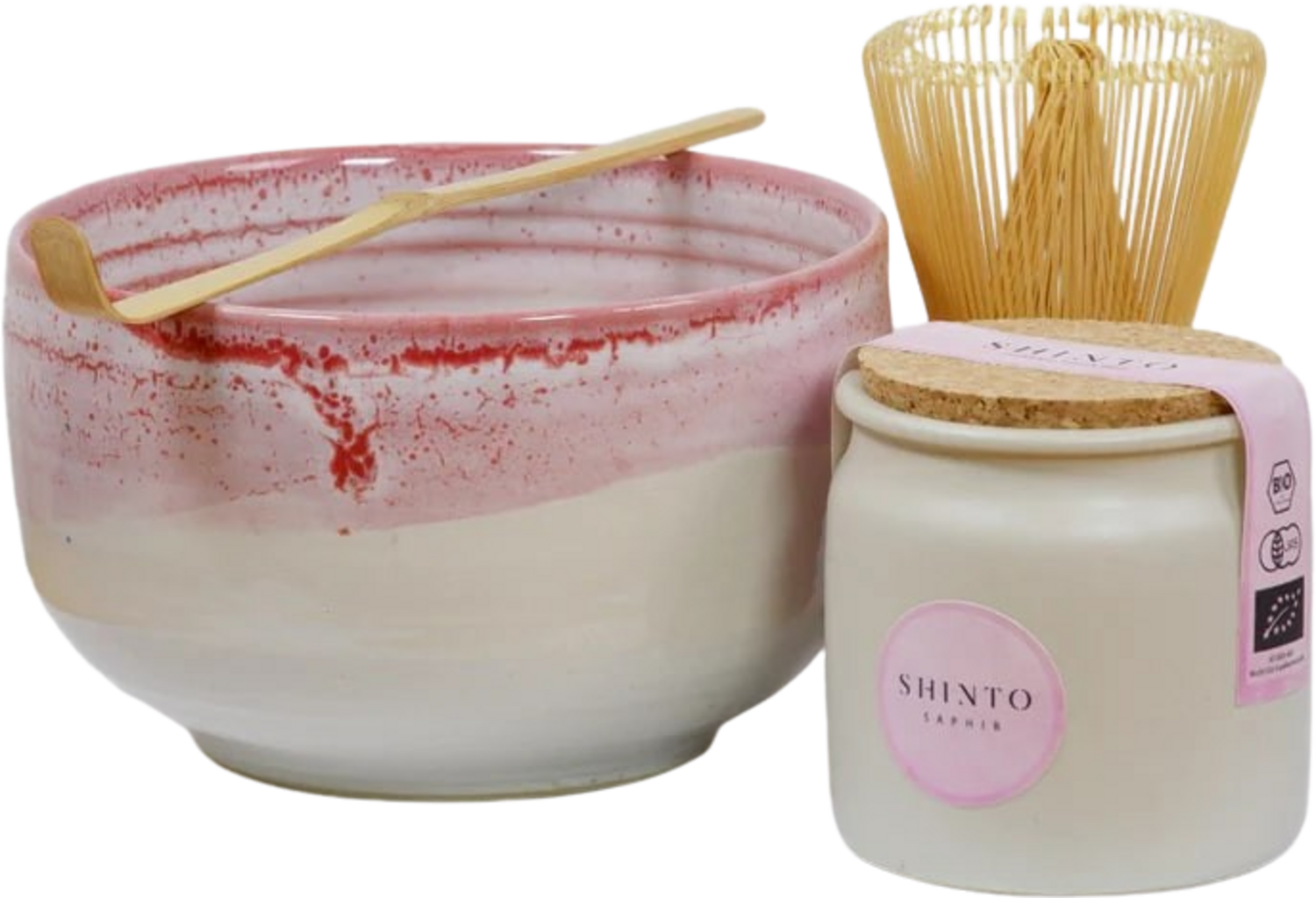 Jotta pääset heti alkuun, setti sisältää myös 30 g Saphir-luomu-matchaa, joka on säilytetty tyylikkäässä savipurkissa.