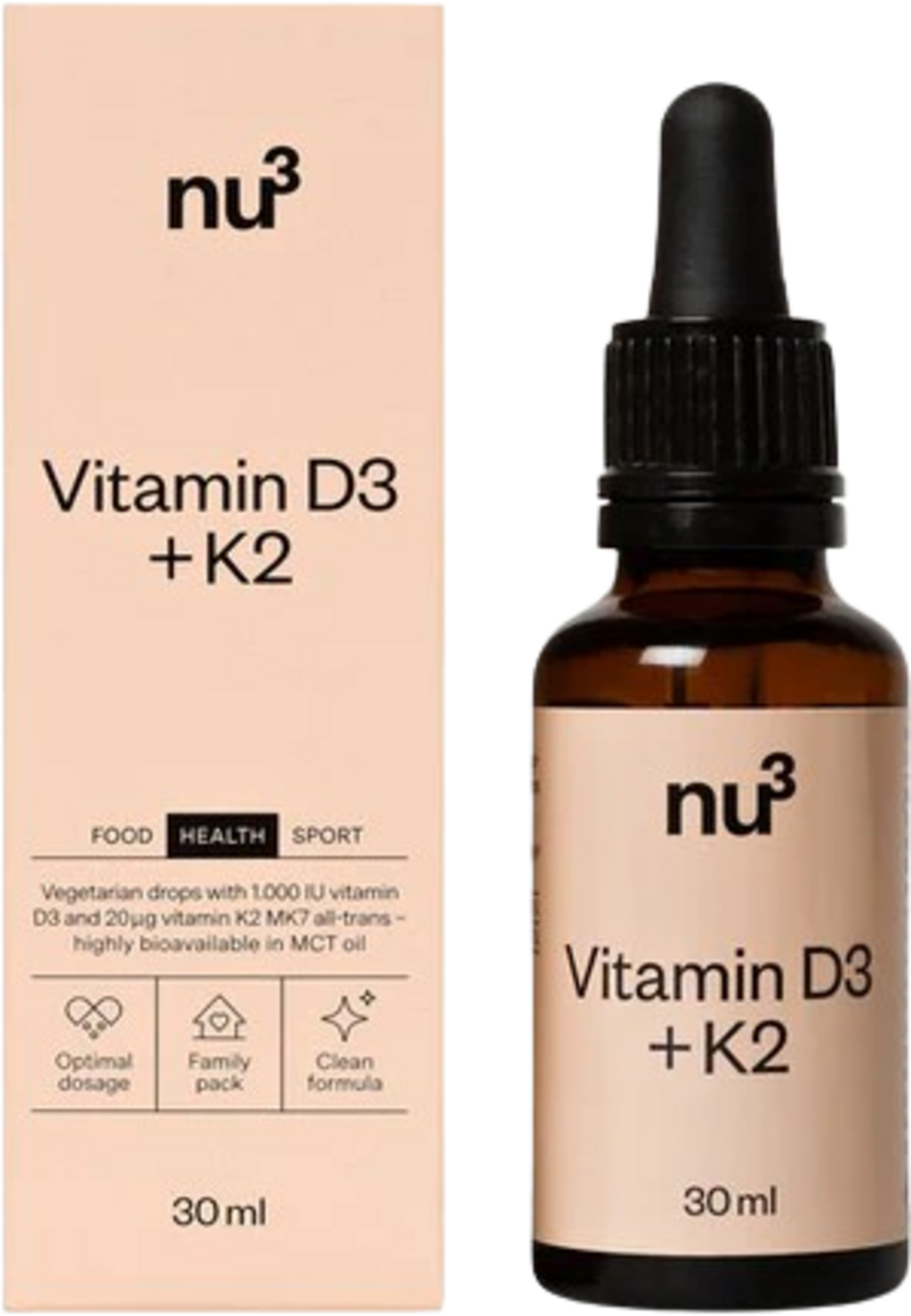 nu3 D3- ja K2-vitamiinitipat yhdistävät 1 000 IU D3-vitamiinia ja 20 μg K2-vitamiinia korkealaatuisessa MK7 all-trans -muodossa. Kookospähkinästä saadussa MCT-öljyssä liuotettuna ne imeytyvät erityisen hyvin ja ovat pipetin ansiosta helppoja annostella.
