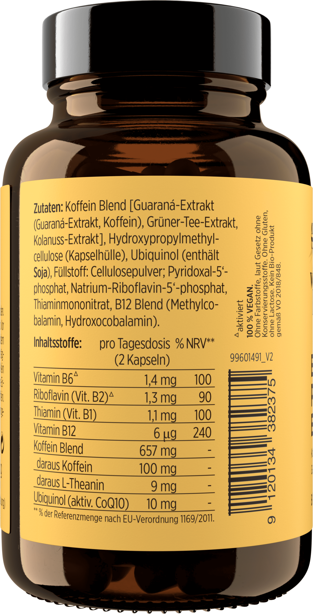 Guarana Extrakt, kofeiini, vihreä tee -uute, kolapähkinä, Hydroxypropylmethylcellulose (Kapselhülle), ubikinoli, Cellulosepulver, pyridoksaali-5-fosfaatti, natriumriboflaviini-5'-fosfaatti, Thiaminmononitrat, Methylcobalamin,