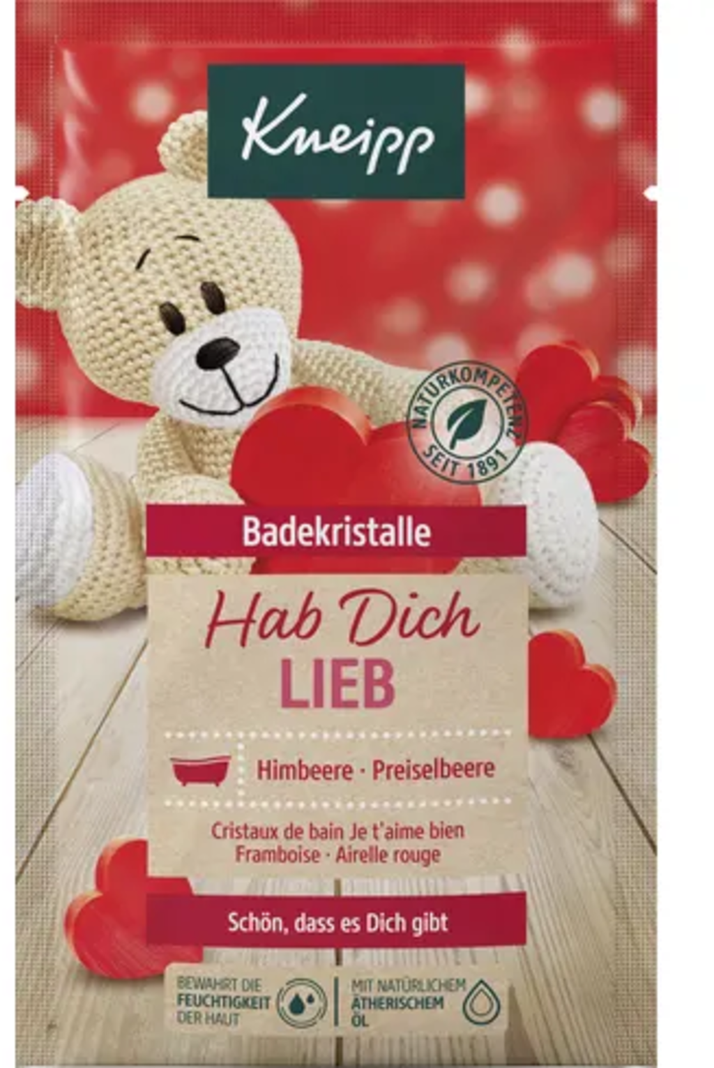 Kneippin Hab Dich lieb kylpykristallit luovat hedelmällisen makeita kylpyhetkiä kylpyhuoneeseen. Vegaaninen koostumus on rikastettu vadelmauutteella ja puolukkaöljyllä.