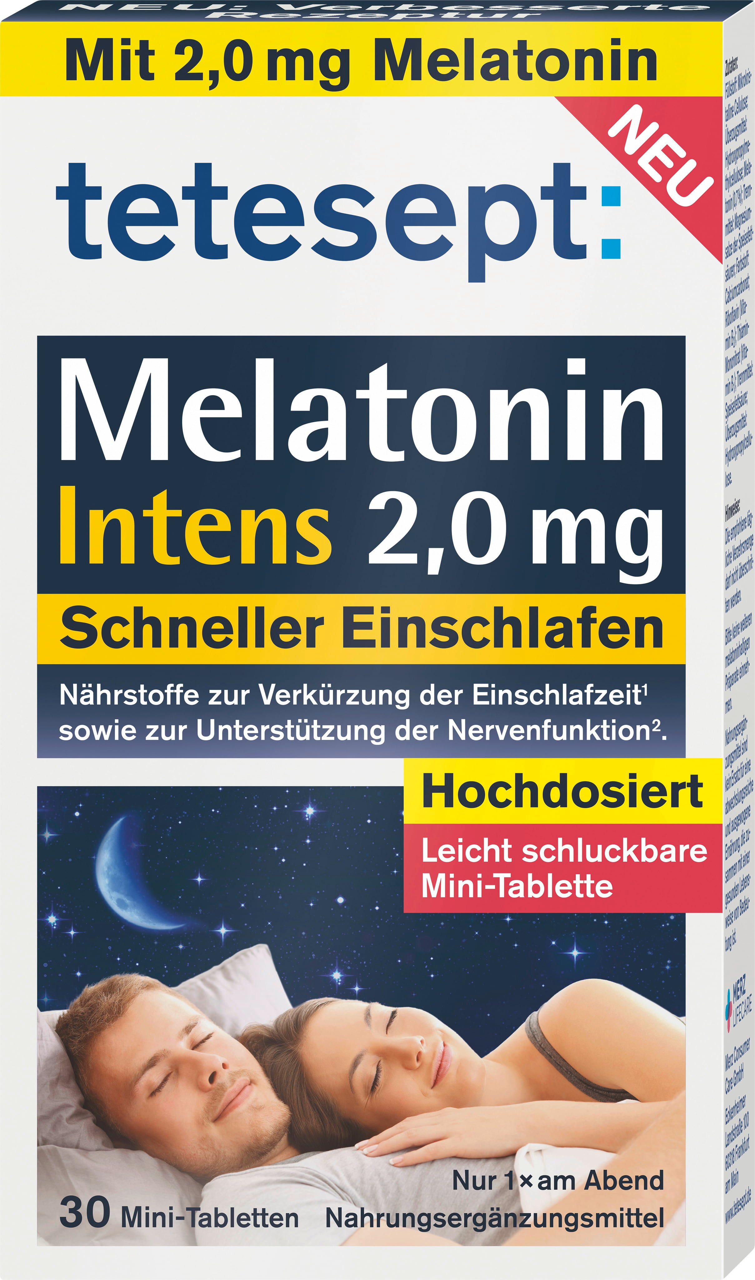 Teteseptin Melatoniini Intens -tabletit sisältävät 2 mg melatoniinia tablettia kohden ja on lisäksi rikastettu B1- ja B2-vitamiineilla. Sen koostumus on vegaaninen eikä sisällä gluteenia tai laktoosia.