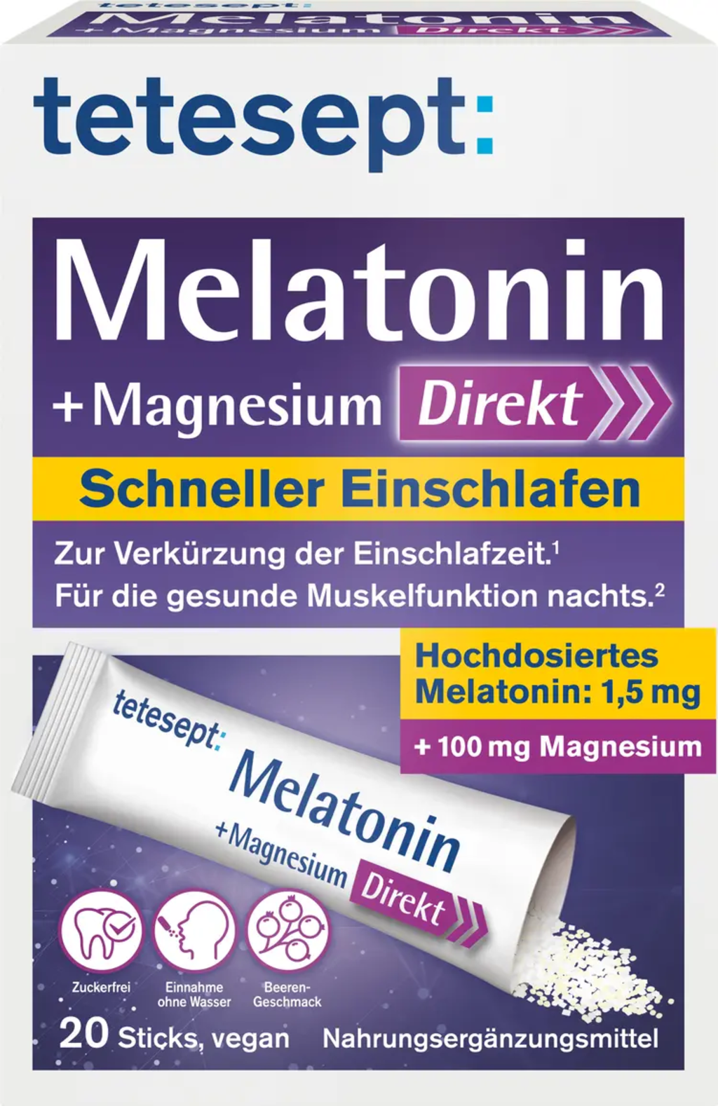 Nämä teteseptin Suoraan Jauheet soveltuvat nopeaan ja kätevään magnesiumin ja melatoniinin saantiin. Hedelmäinen marjan maku tekee käytöstä erityisen miellyttävää. Koostumus on vegaaninen.