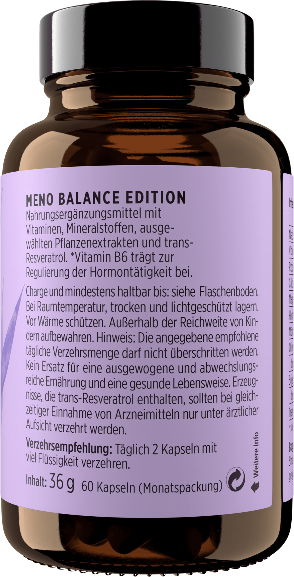 MENO BALANCE -VERSIO yhdistää huolellisesti valitut kasviuutteet, kuten neidonhiuspuun, humalan, oliivinlehden ja soijan, sekä trans-resveratrolin. Reseptiä täydentävät B2-, B3- ja B6-vitamiinit sekä kalsium ja magnesium.