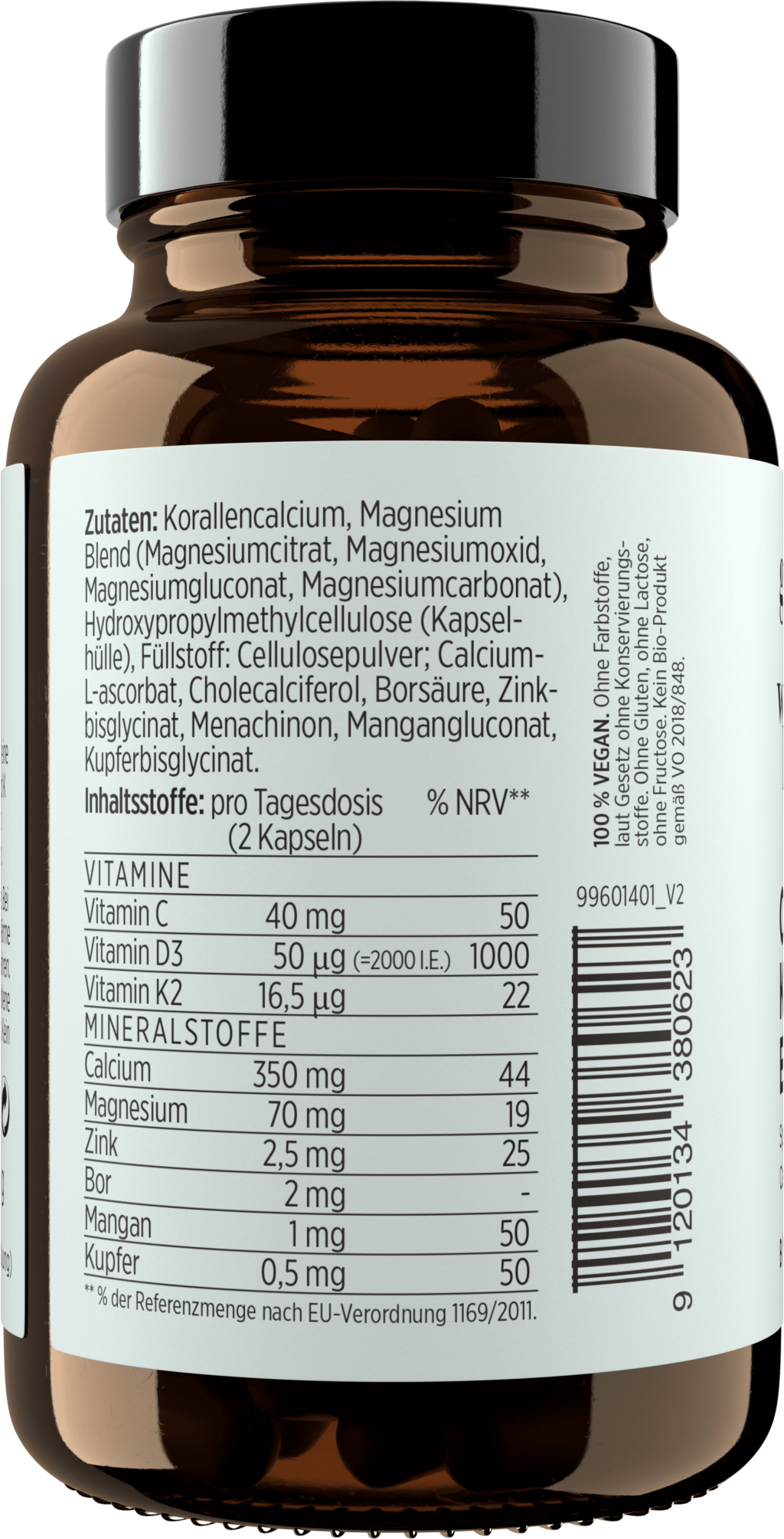 Korallen-Calcium, Magnesiummischung (Magnesiumcitrat, Magnesium (als Oxid), Magnesiumgluconat, Magnesiumcarbonat), Kapselhülle (Hydroxypropylmethylcellulose), Füllstoff (selluloosa), Calcium-L-Ascorbat, D3-vitamiini (kolekalsiferoli), boorihappo, sinkki-bisglysinaatti, Menachinon, Mangangluconat, Kupferbisglycinat
