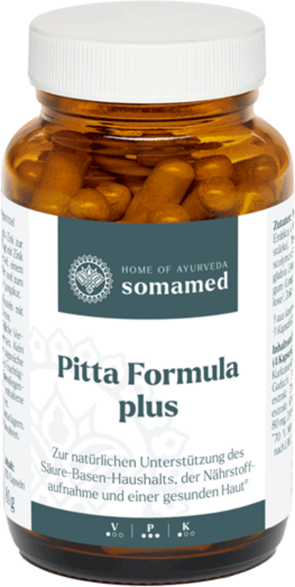 Pitta Formula plus -resepti yhdistää tarkkaan valitut yrtit ja uutteet, jotka ovat arvostettuja Ayurvedassa Pitta-doshan harmonisoimiseksi. Formulointi on täydennetty sinkillä, joka tukee normaalia happo-emästasapainoa ja auttaa ylläpitämään normaalia ihoa.