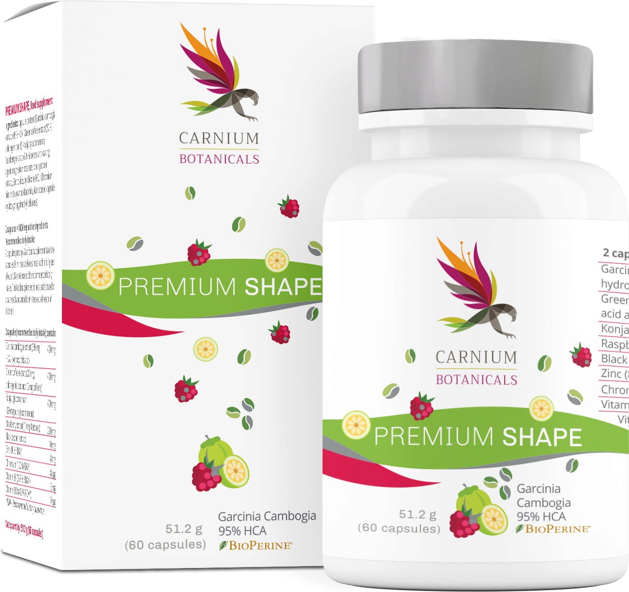 Carnium Botanicals Premium Shape -kapselit sisältävät mustapippurin ja vadelman uutteita, vitamiineja ja kivennäisaineita. Koostumus on vegaaninen eikä sisällä säilöntäaineita.