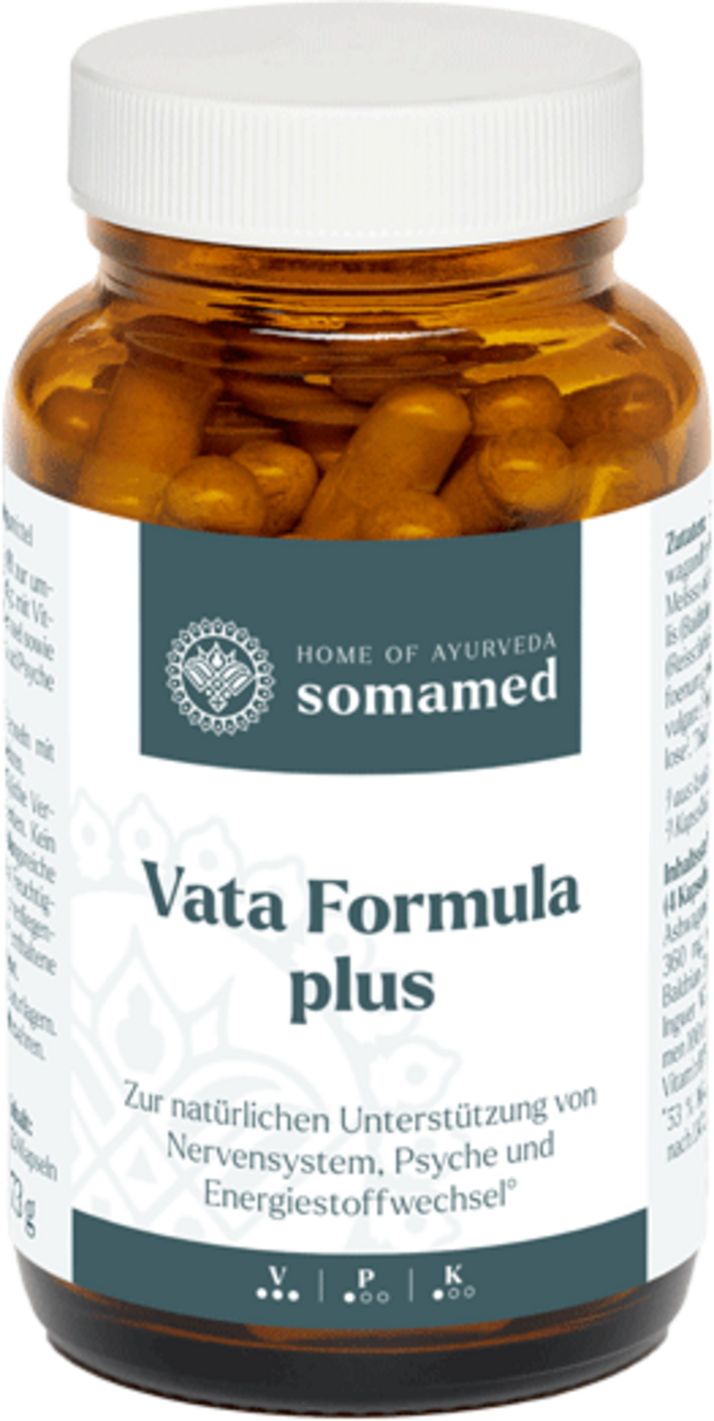 Vata Formula Plus yhdistää valikoituja yrttejä ja uutteita, joita arvostetaan suuresti ayurvedassa, tavoitteenaan auttaa harmonisoimaan Vata doshaa. Jotta koostumus olisi täydellinen, valitut kasviaineet on yhdistetty B1-vitamiiniin. B1-vitamiini edistää hermoston normaalia toimintaa ja psyykkistä hyvinvointia.