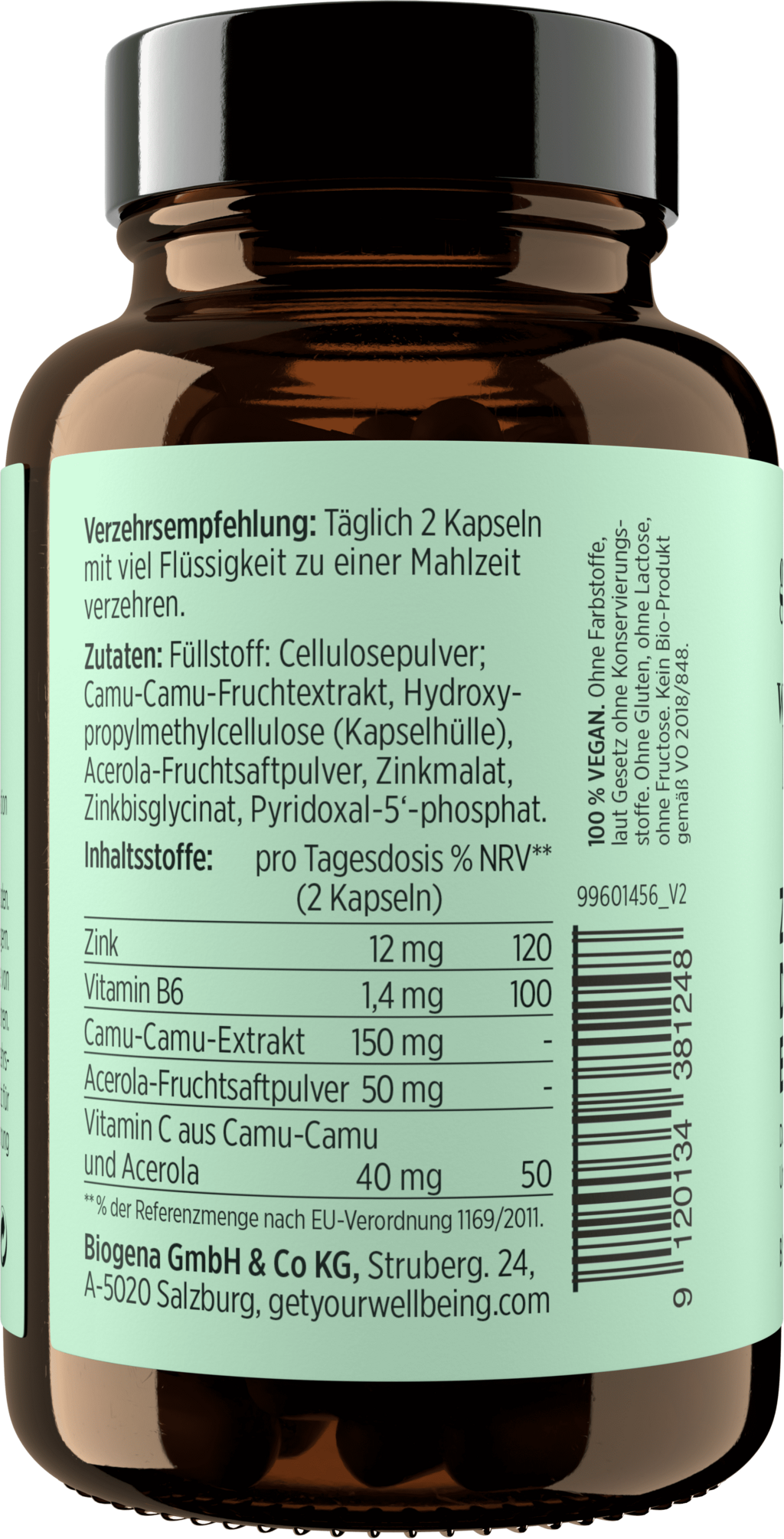 Füllstoff (selluloosa), Camu-Camu-Extrakt, Hydroxypropylmethylcellulose (Kapselhülle), Acerola (Malpighia glabra) -jauhe, Zinkmalat, sinkki-bisglysinaatti, pyridoksaali-5-fosfaatti