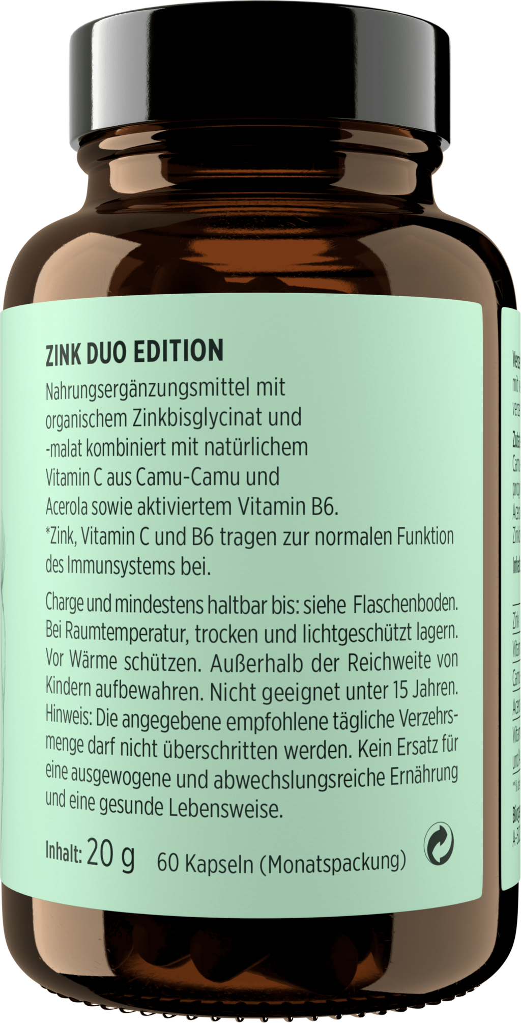 ZINK DUO EDITION tarjoaa kohdennetun yhdistelmän orgaanista sinkkibisglysinaattia ja -malaattia, luonnollista C-vitamiinia camu camusta ja acerola-kirsikasta sekä aktivoitua B6-vitamiinia. Tämä huolellisesti tasapainotettu koostumus soveltuu erinomaisesti henkilöille, jotka etsivät täsmä sinkkivalmistetta.