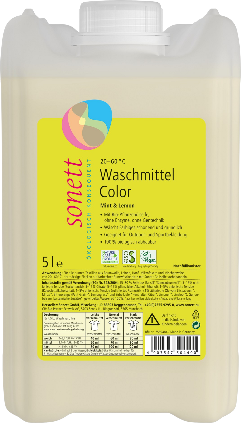 Sonett Nestemäinen Color-pesuaine kirjopyykille, minttu ja sitruuna, 5 l