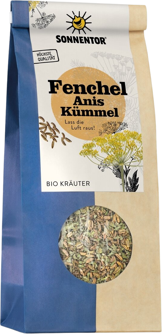 Tämän hyväksi havaitun fenkolin, aniksen ja kuminan yhdistelmän avulla saat täydellisen päätöksen ateriallesi mukiisi. Tämä irtotavara luomuteesekoitus Sonnentorilta vakuuttaa ainutlaatuisella makuprofiilillaan: Sinua odottaa harmoninen yhdistelmä mausteista ja miellyttävän makeaa vivahdetta, jonka jokaisen osan eteeriset aromit kantavat.