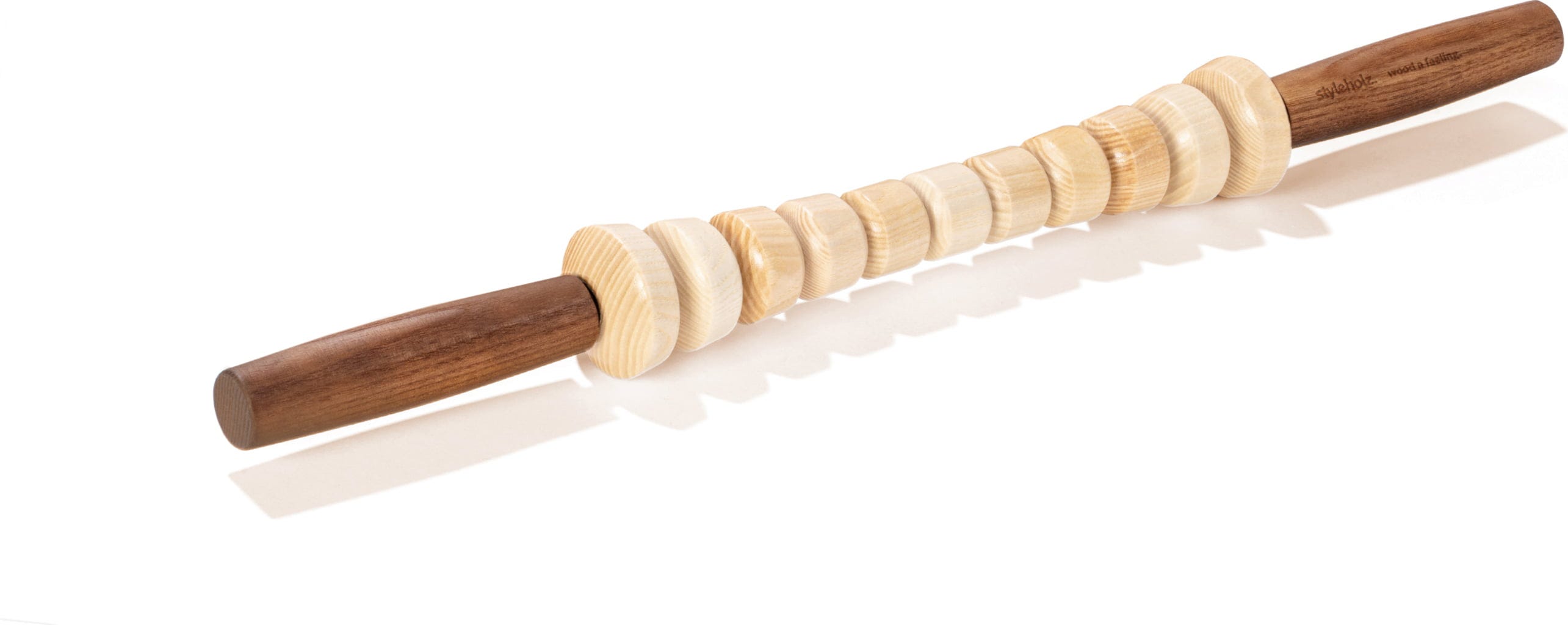 Styleholzin Woodstick FLEX erottuu erityisen joustavuuden ja näyttävän pintarakenteen ansiosta. Se on valmistettu korkealaatuisesta, kotimaisesta saarnipuusta itävaltalaisessa manufaktuurissa. Keppi mukautuu joustavan ytimen ansiosta ihanteellisesti kehosi muotoihin. Pinta antaa voimakkaan pistekohtaisen ärsytyksen käytön aikana suurilla lihasryhmillä, kuten reisillä, pohkeilla tai selässä. Kuulalaakeroitujen rullien ansiosta työkalu liukuu pehmeästi iholla, ja ergonomisista kahvoista saat aina täyden kontrollin intensiteettiin. Luonnonöljyllä viimeistelty puu on erityisen ihoystävällinen ja kestävä.