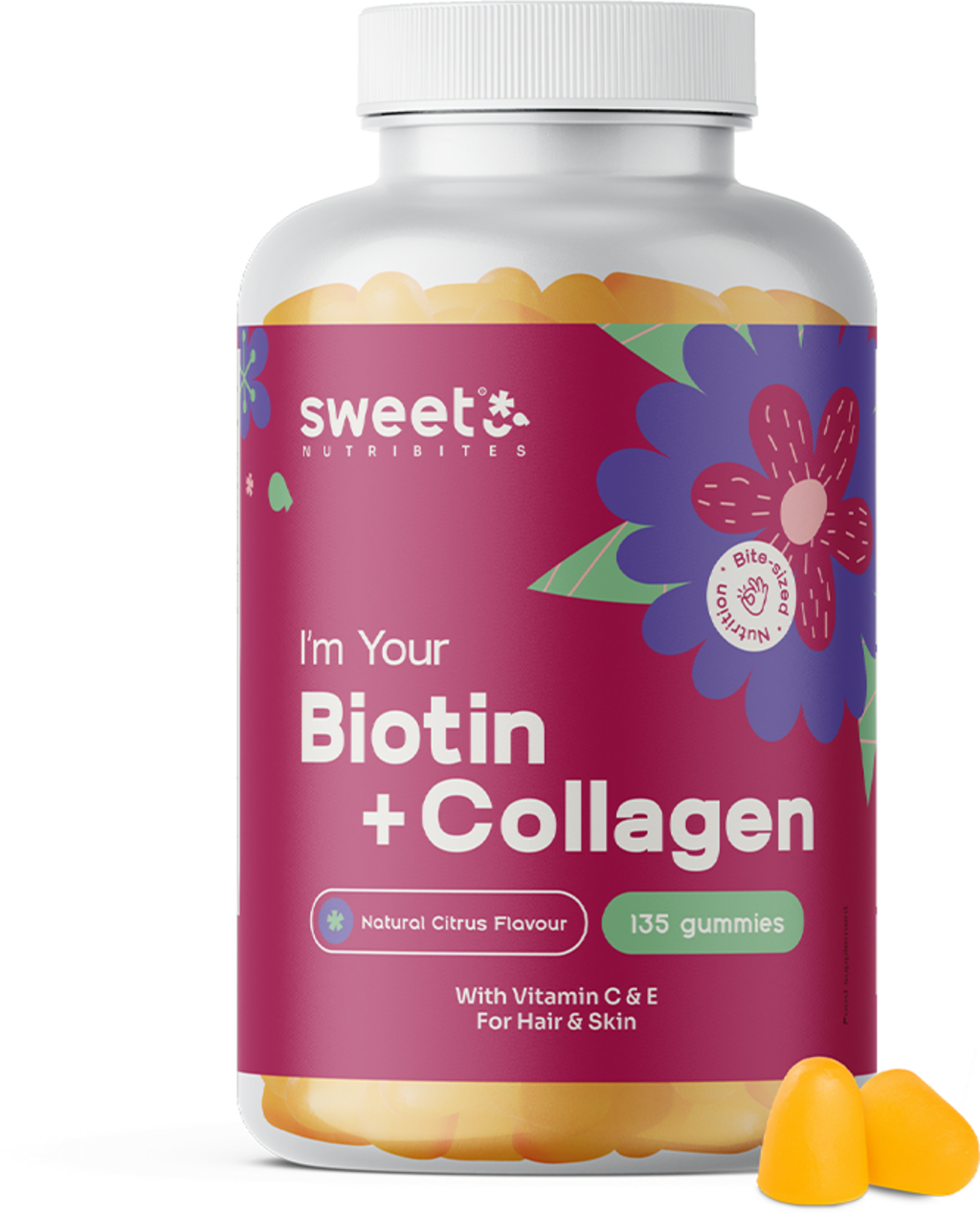 Sweet Nutribitesin Biotiini + Kollageeni hedelmäkarkit sopivat erinomaisesti päivittäiseen käyttöön. Biotiini tunnetaan myös nimellä B7-vitamiini, eikä keho pysty tuottamaan sitä itse. Yhdessä kollageenin sekä C- ja E-vitamiinien kanssa nämä hedelmäkarkit tarjoavat optimaalisen tuen arjessa. Luonnollinen sitrusmaku tekee nauttimisesta erityisen hedelmäisen kokemuksen.