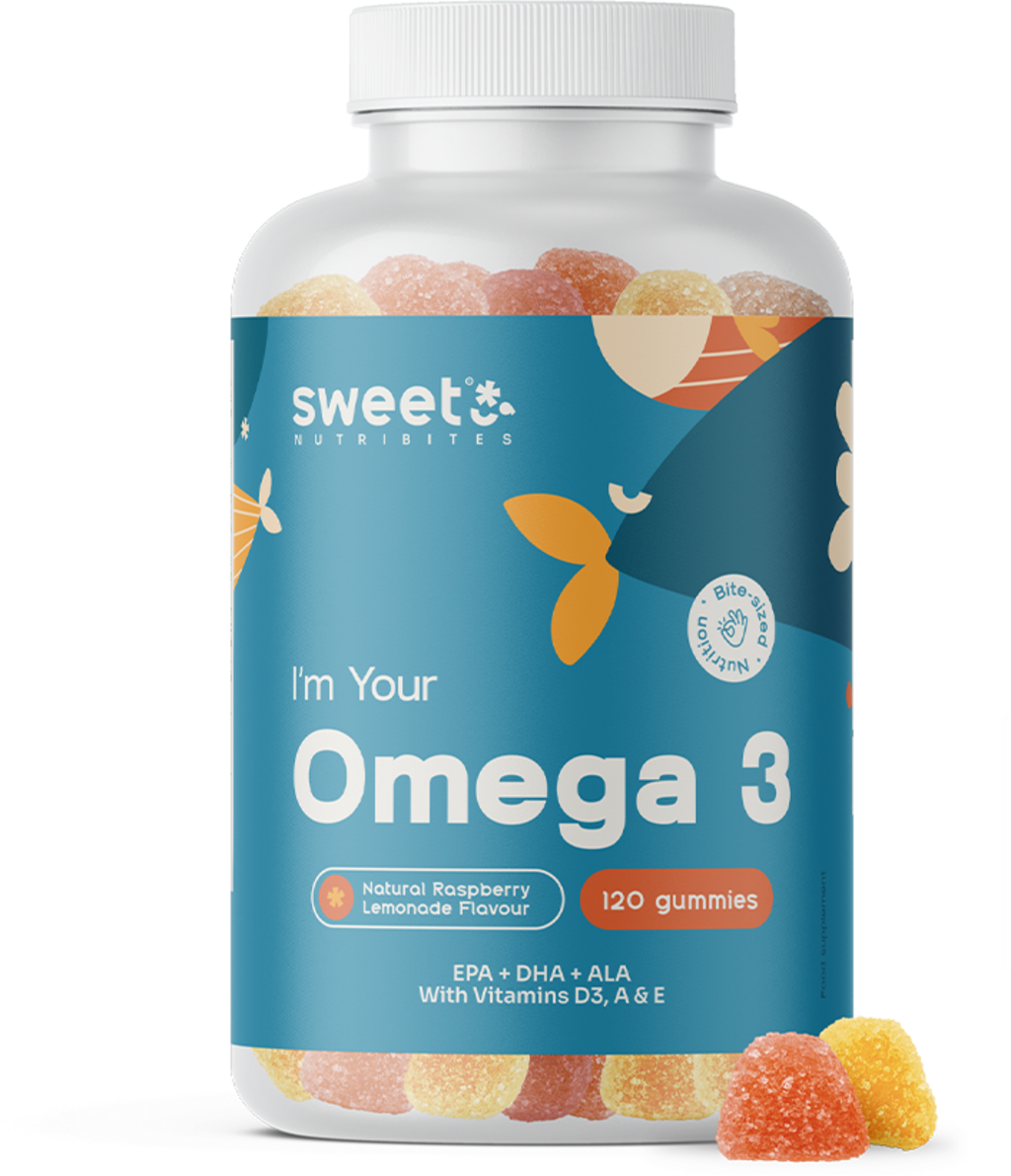 Sweet Nutribitesin gluteenittomat Omega-3-kumit tarjoavat EPA:a, DHA:ta ja ALA:a korkealaatuisesta, puhdistetusta kalaöljykonsentraatista. Lisäksi kumit ovat vahvistettuja A-, D3- ja E-vitamiineilla. E-vitamiinin avulla rasvahapot hapetetaan, mikä takaa kalaöljyn laadun ja stabiilisuuden kumikarkeissa. Miellyttävä vadelmalimonadin maku tarjoaa hedelmäisen kokemuksen nauttimisen aikana.