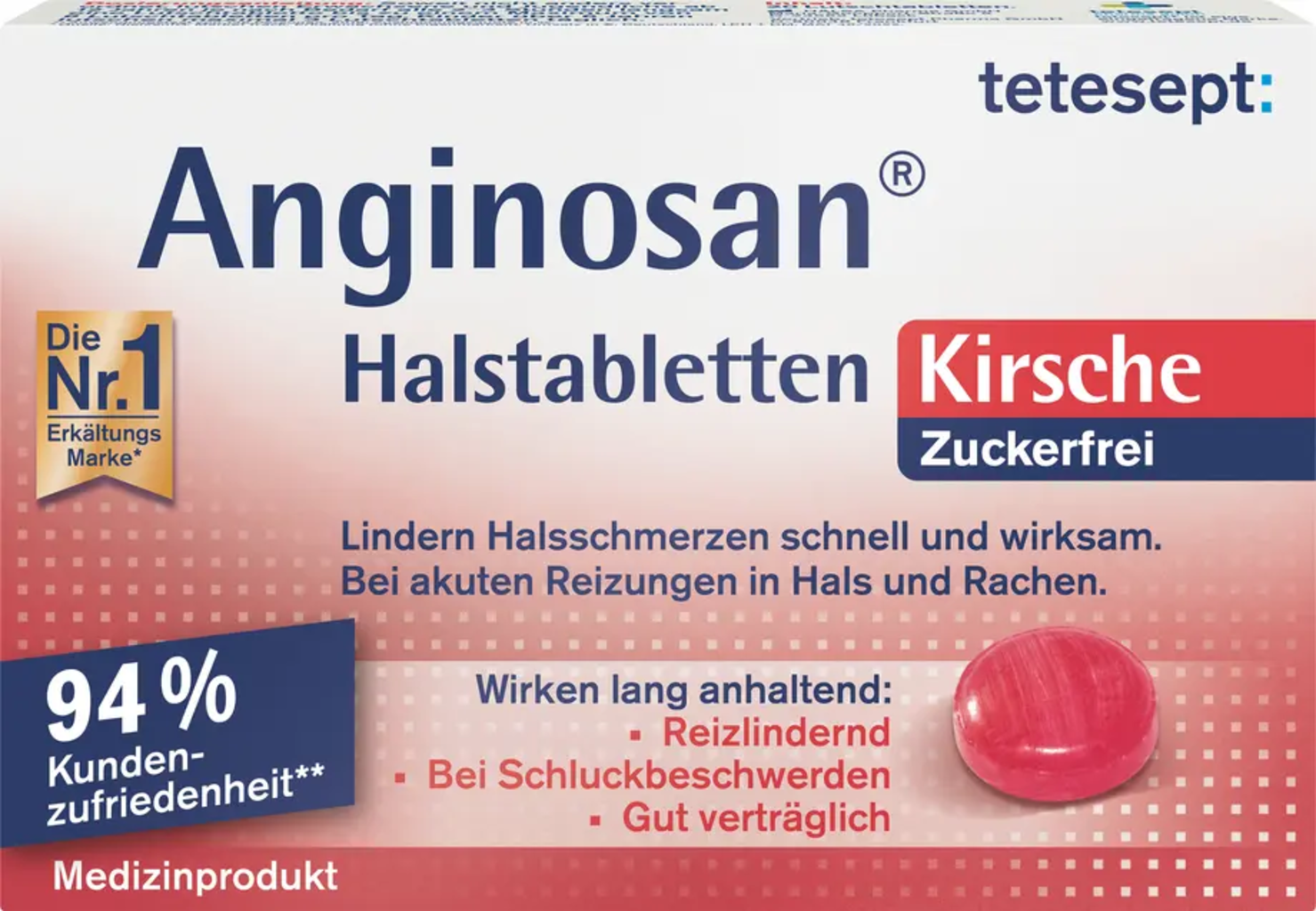 teteseptin hedelmäisen kirsikan makuiset Anginosan imeskelytabletit sopivat aikuisille ja lapsille 6-vuotiaista alkaen. Tabletteja valmistetaan ilman lisättyä sokeria.