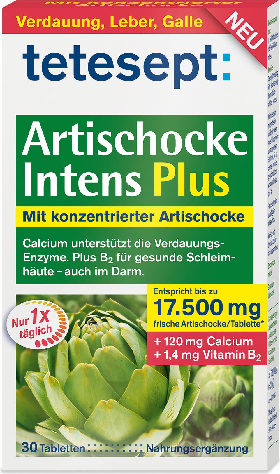 Artisokka Intens Plus -tabletit teteseptiltä sisältävät artisokanlehtiuutteen lisäksi myös kalsiumia ja B2-vitamiinia. Vain yksi tabletti päivässä voi tukea kehoasi optimaalisesti. Koostumus on gluteeniton ja laktoositon.