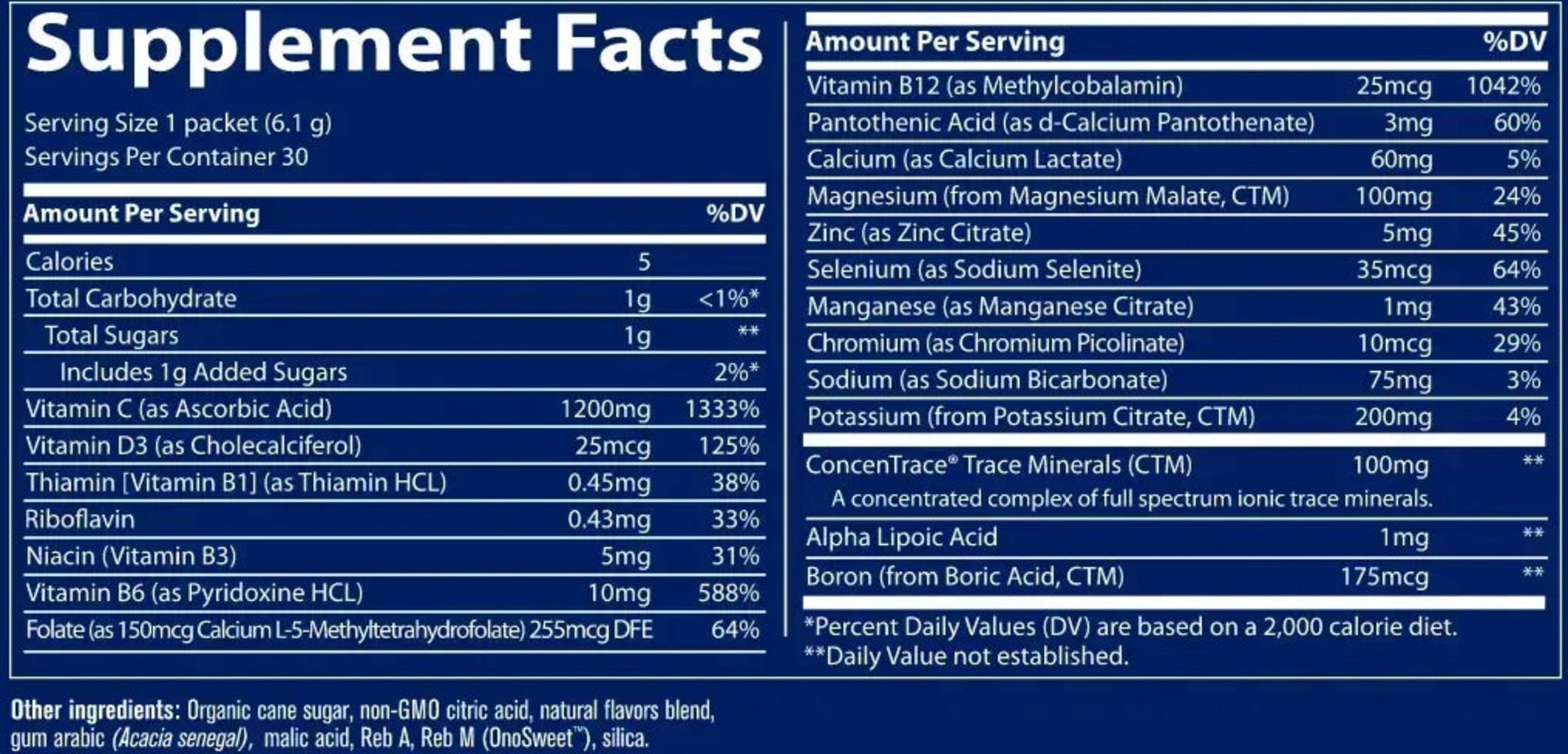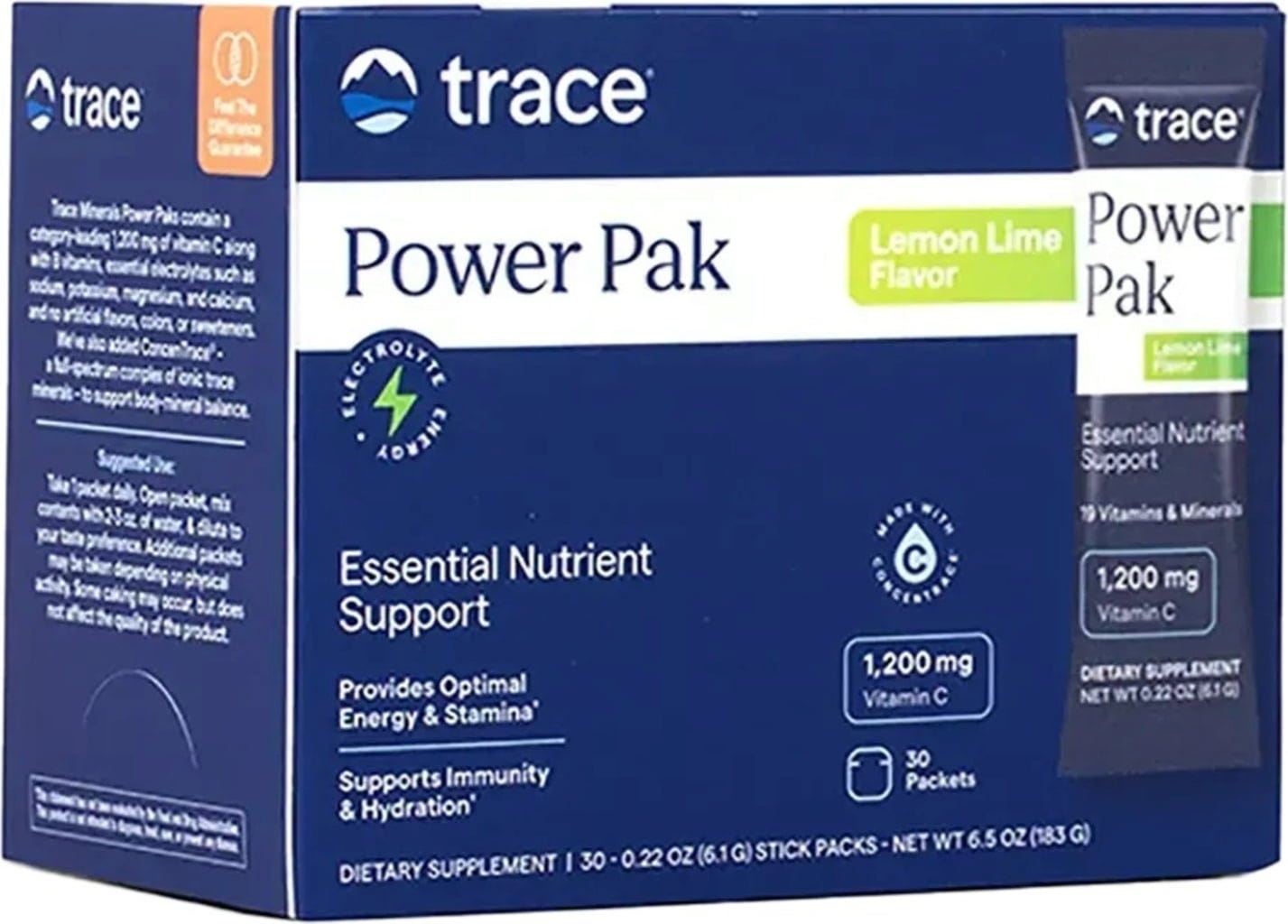 Trace Minerals Researchin Power Pak sisältää 1 200 mg C-vitamiinia ja tunnettua hivenainekonsentraattia, Concentrace®, 72 eri elektrolyyttiä.