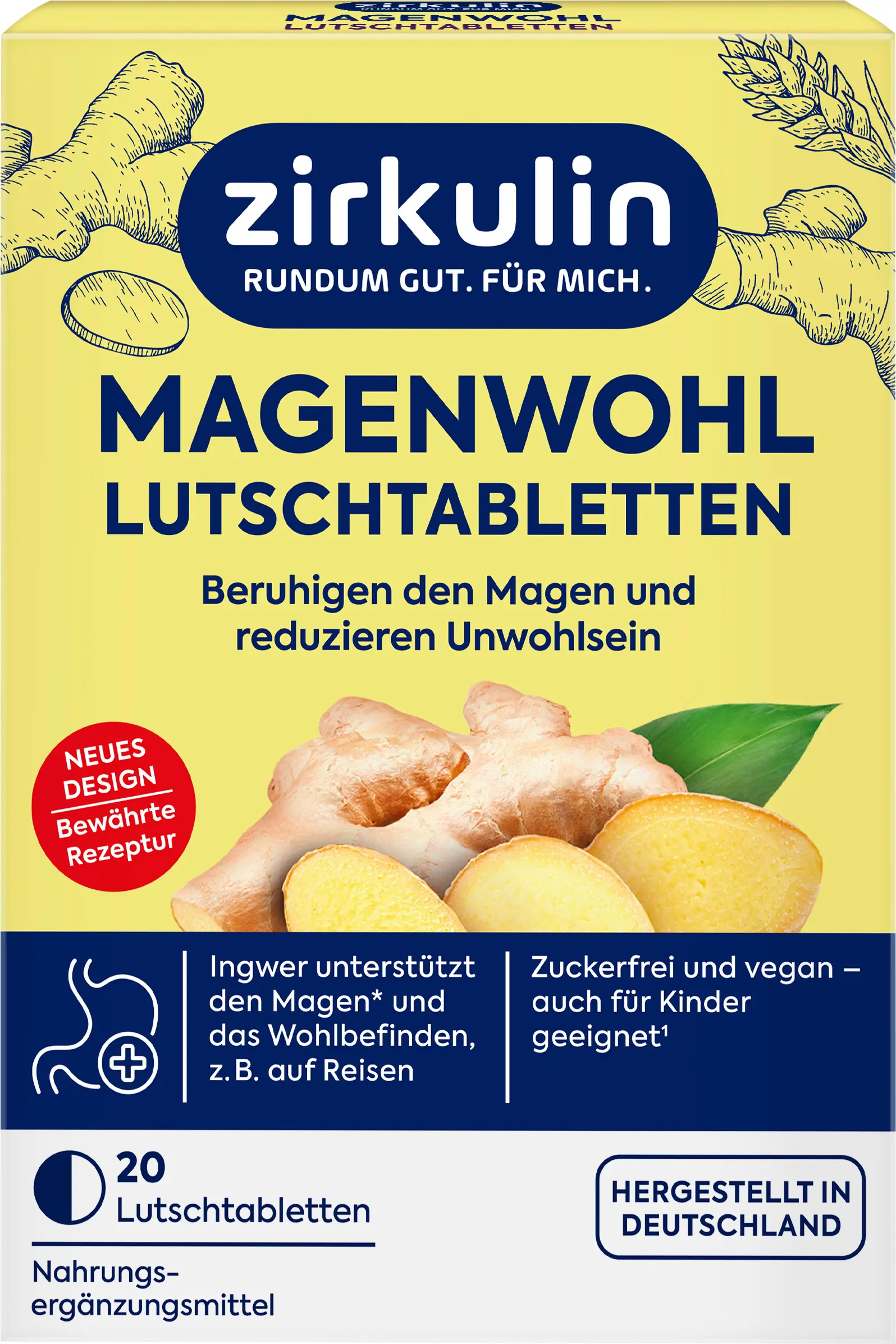 Zirkulinin Magenwohl-tabletit valmistetaan arvokkaalla inkivääriuuteella ilman lisättyä sokeria. Ne makeutetaan Steviasta peräisin olevilla stevioliglykosideilla. Ne soveltuvat ihanteellisesti matkoille ja niitä voivat käyttää myös yli 6-vuotiaat lapset.